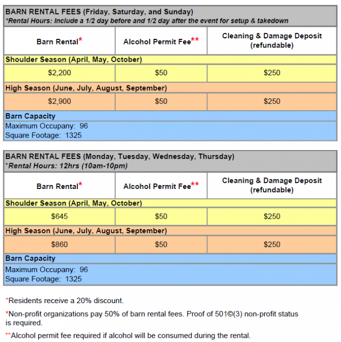 The Stein-Boozier Barn is available for rent from mid-April through mid-October, though rental applications are accepted year-round.